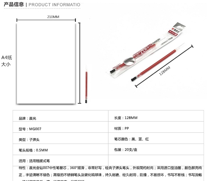 晨光 中性笔替芯 MG007 0.5mm 晨光水笔芯 子弹头中性笔芯 替芯 盒(20支)